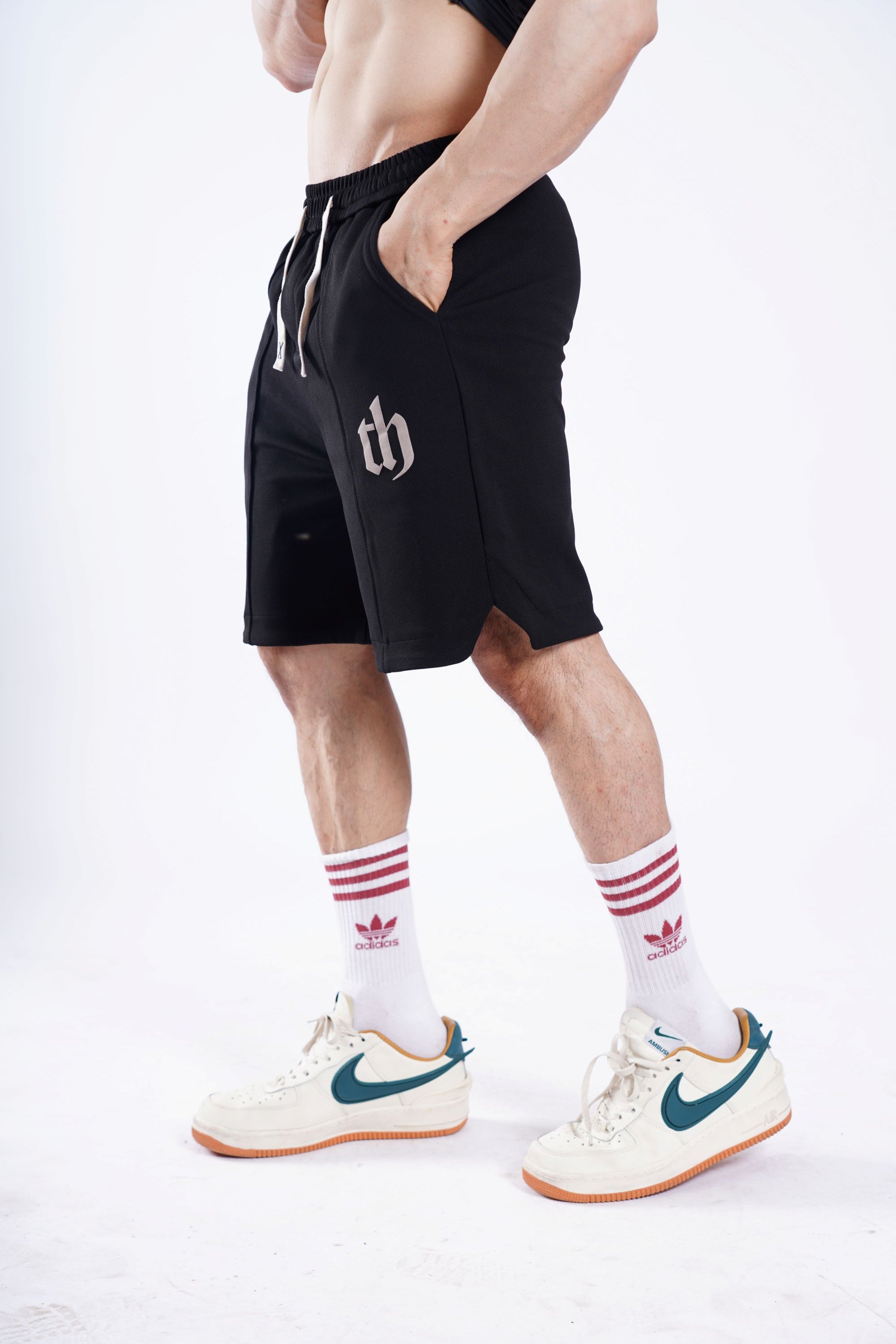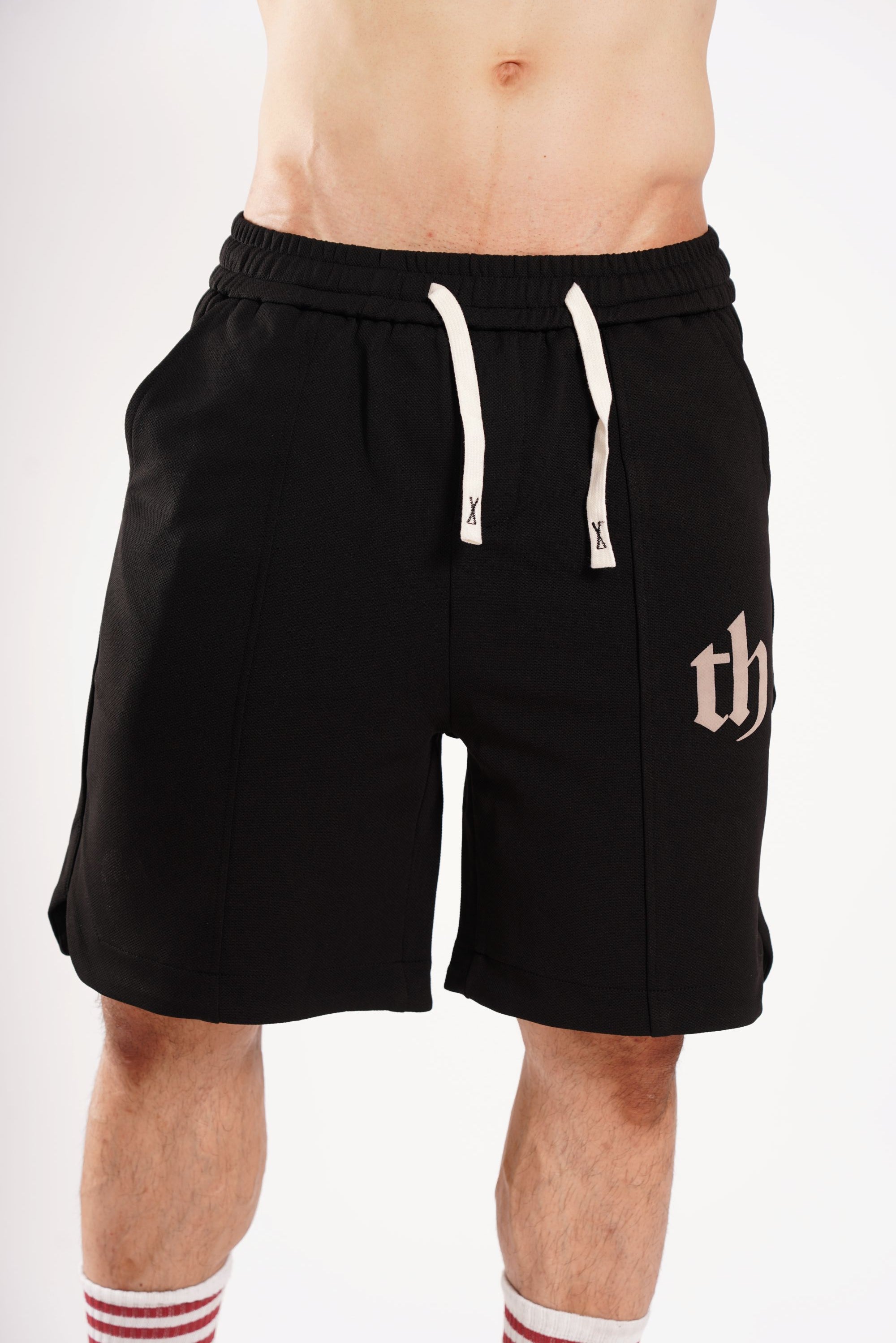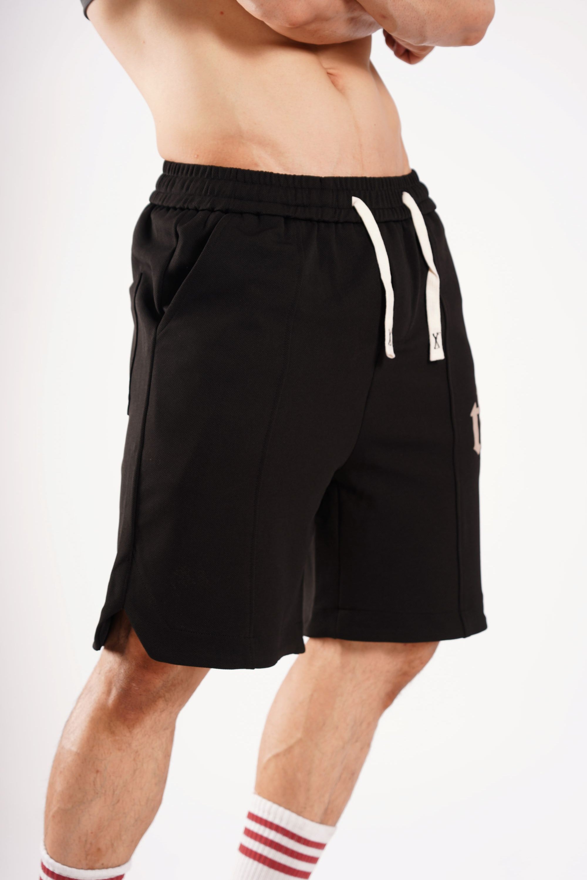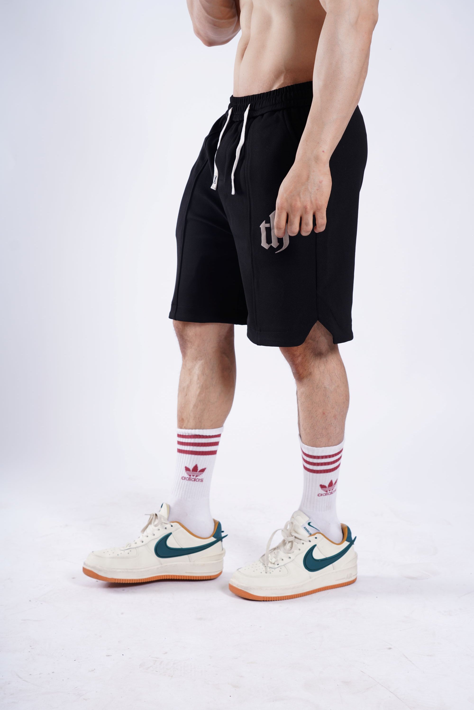 The tailored above-knee cut enhances leg definition, while the minimalist gothic monogram adds a refined signature touch. Elastic waistband with adjustable drawstrings ensures a secure fit, and functional pockets keep it practical without compromising style.