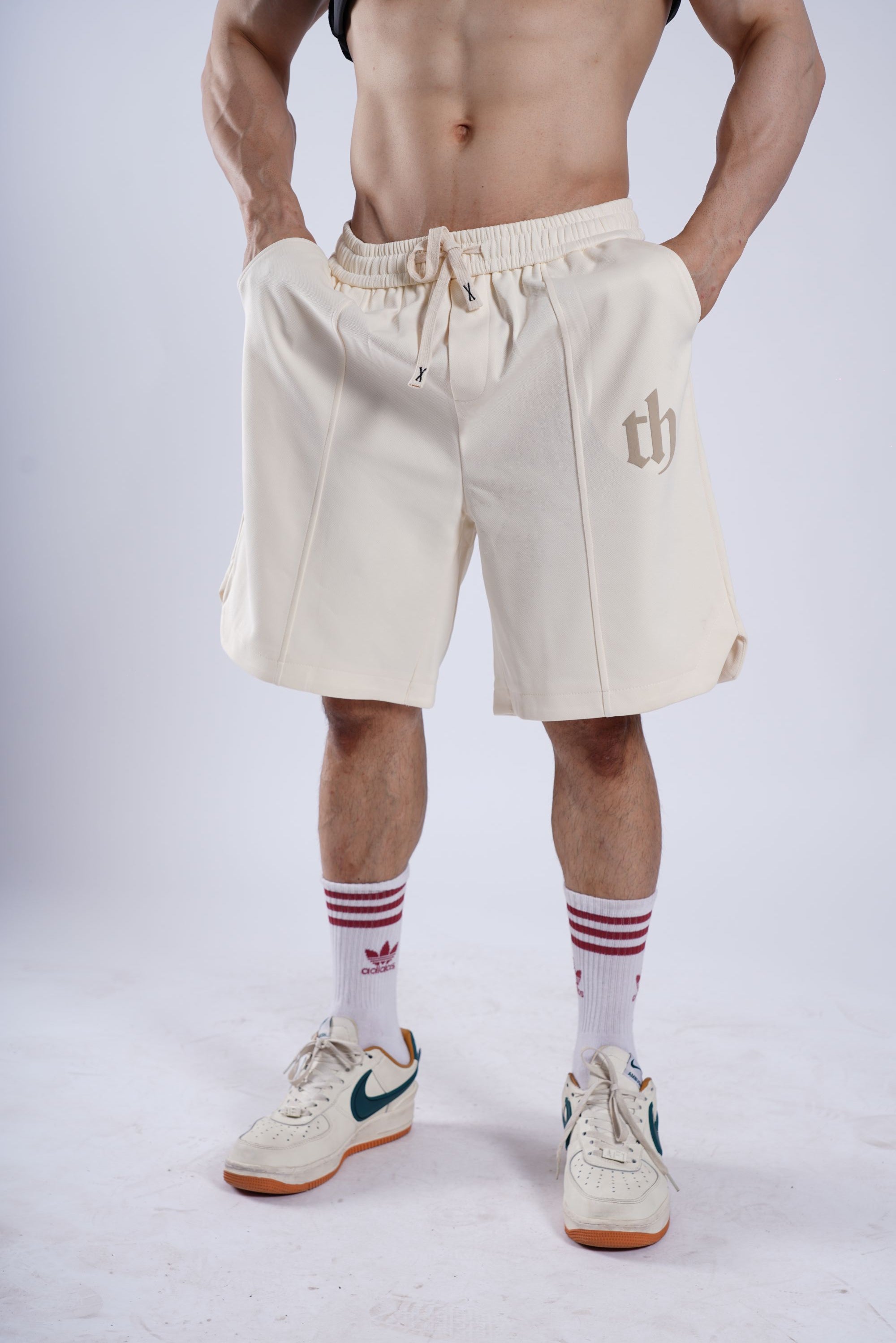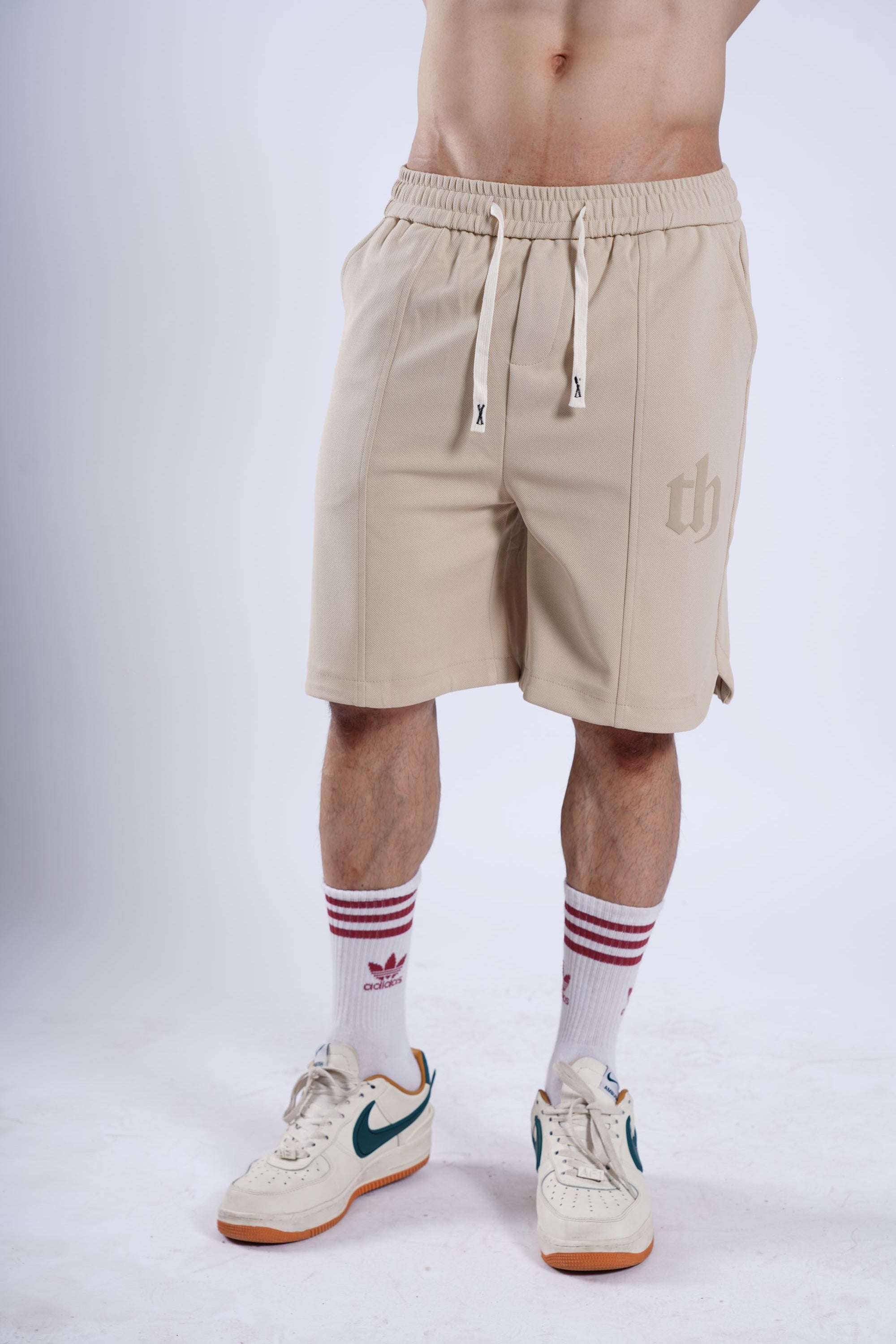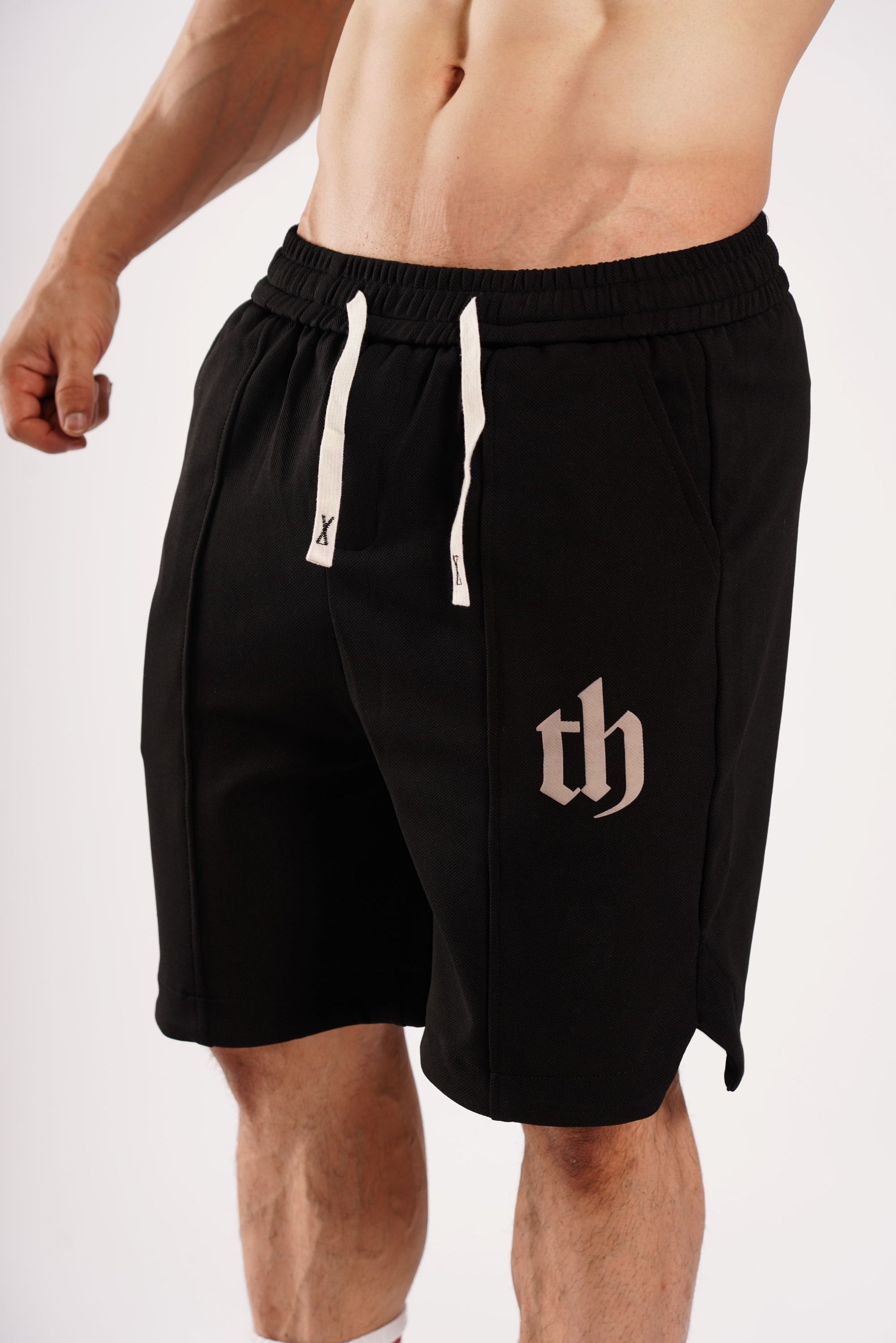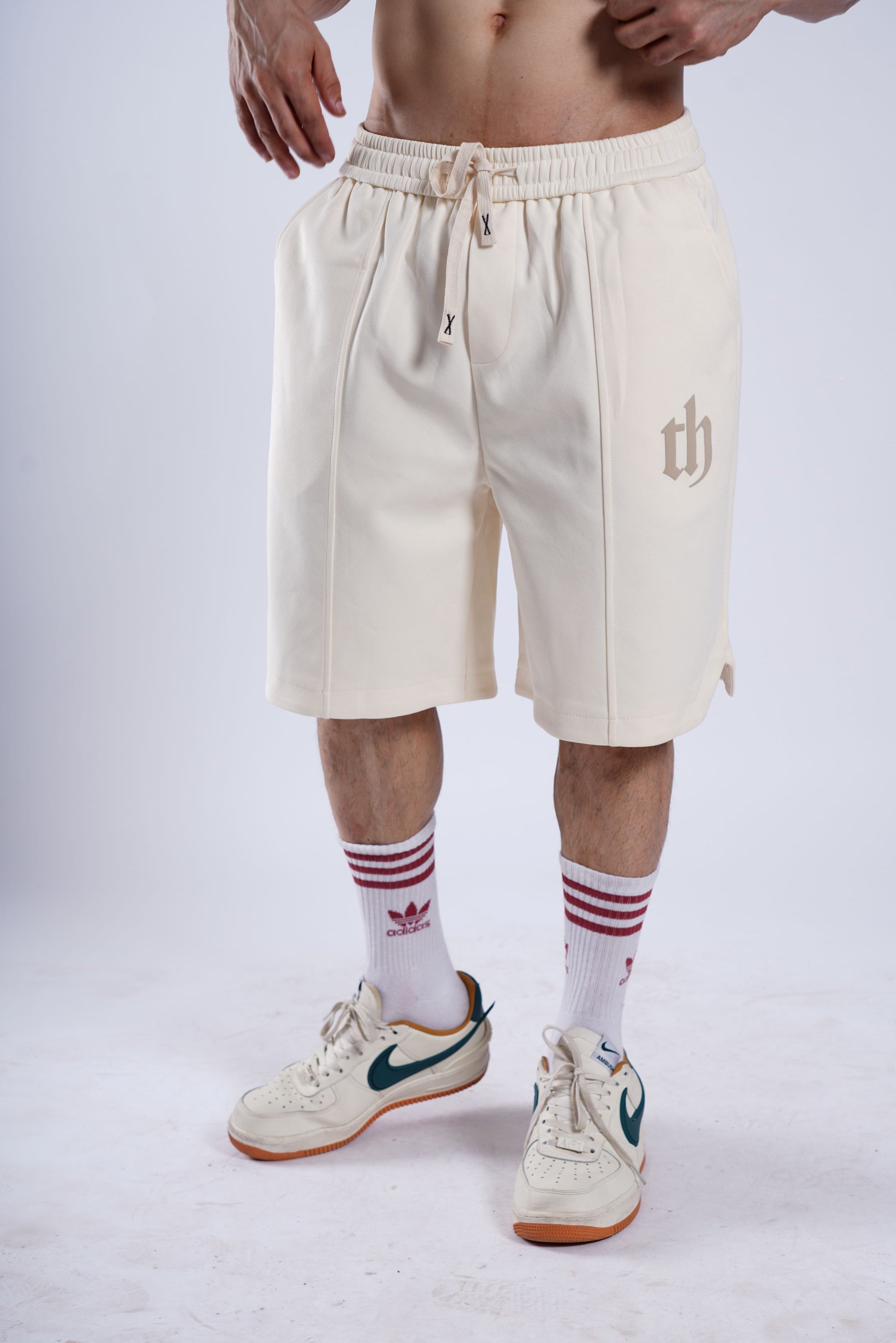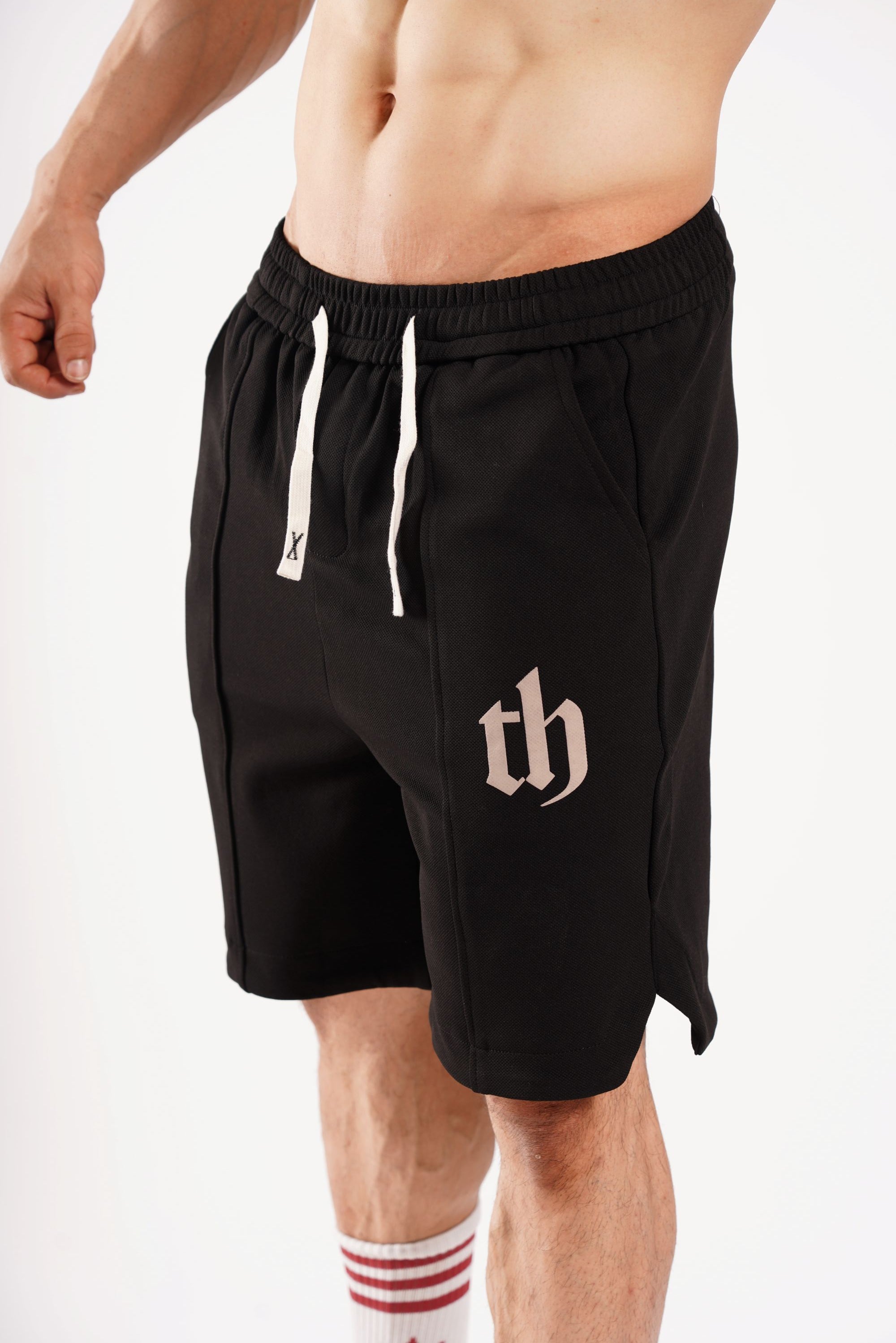 The tailored above-knee cut enhances leg definition, while the minimalist gothic monogram adds a refined signature touch. Elastic waistband with adjustable drawstrings ensures a secure fit, and functional pockets keep it practical without compromising style.