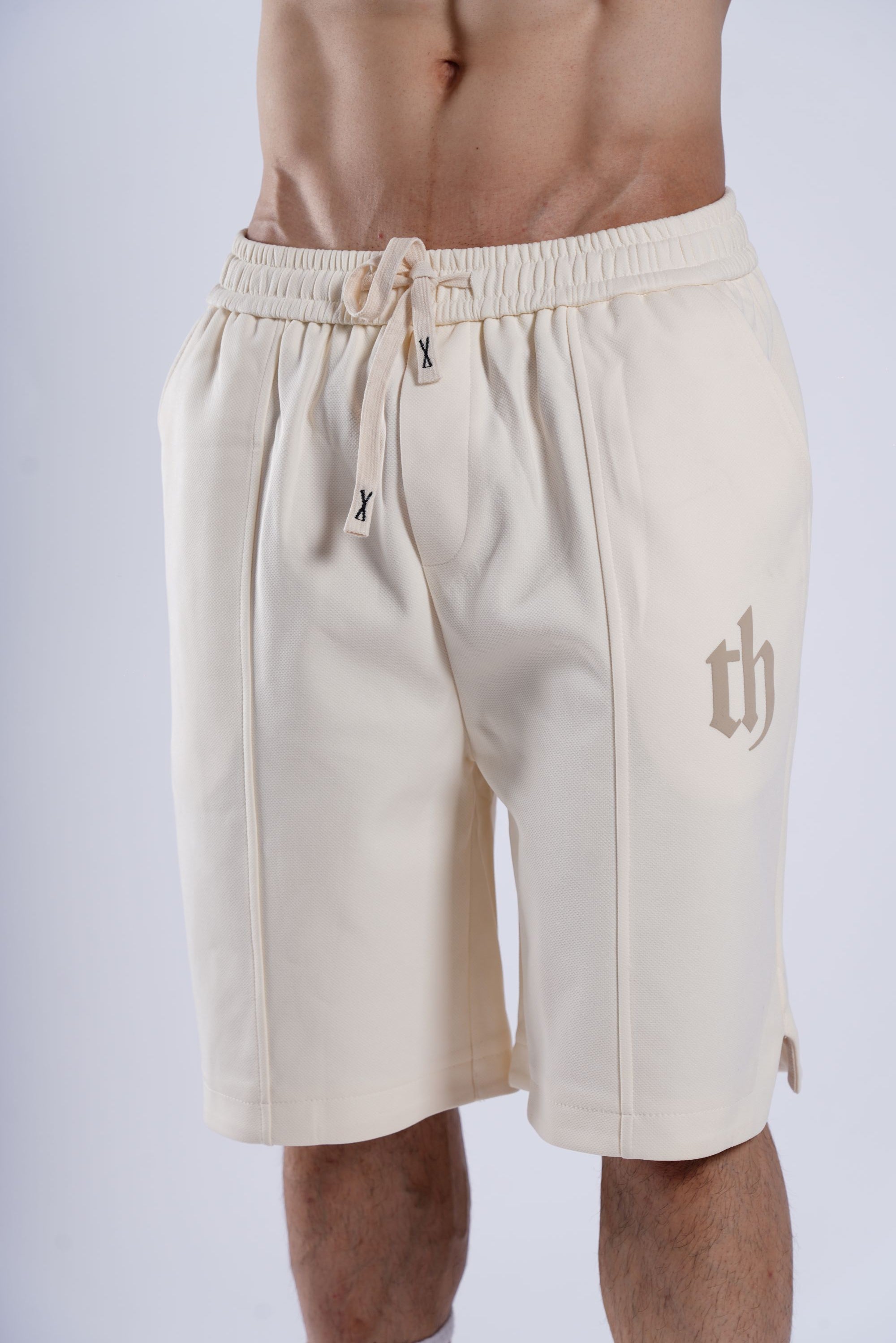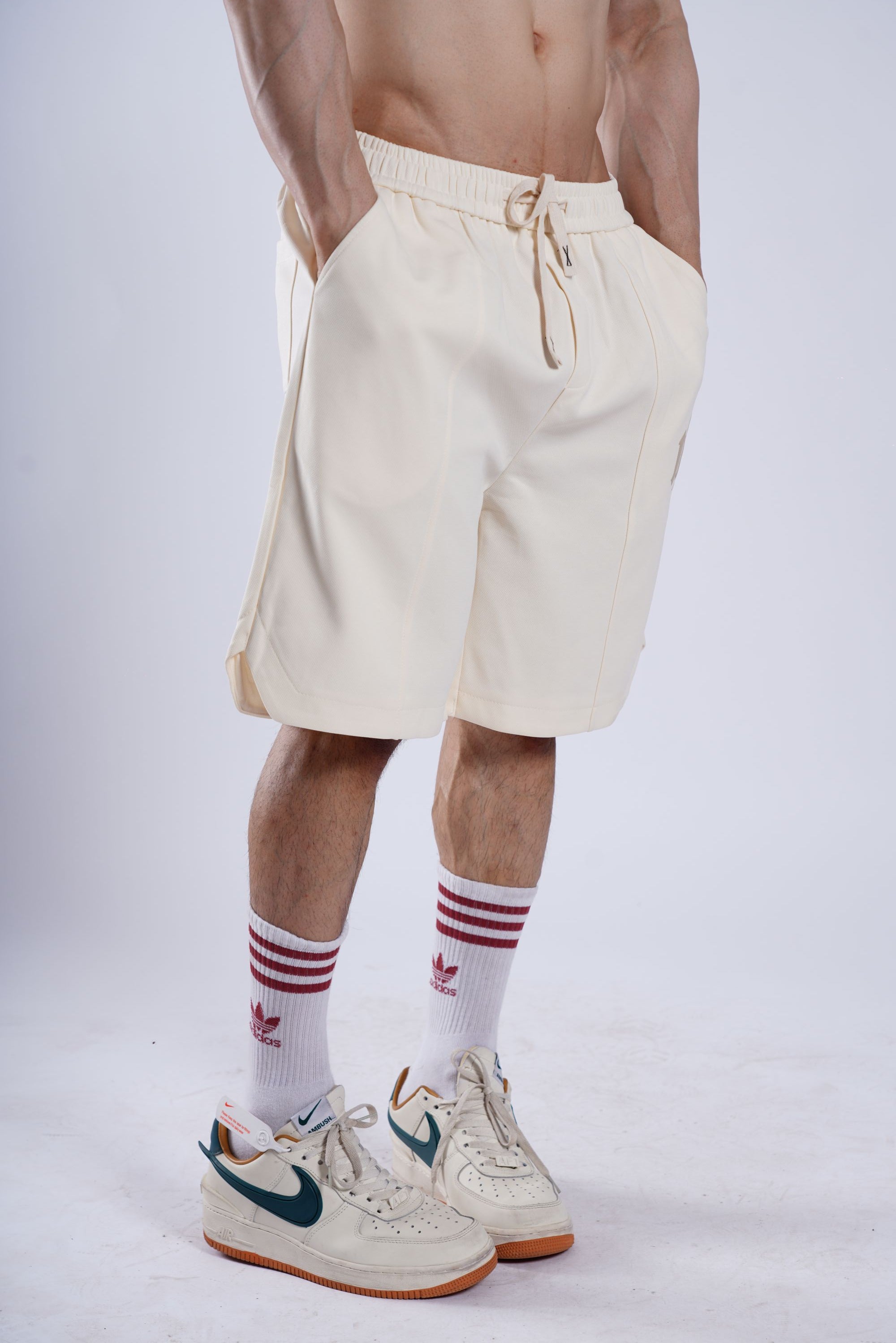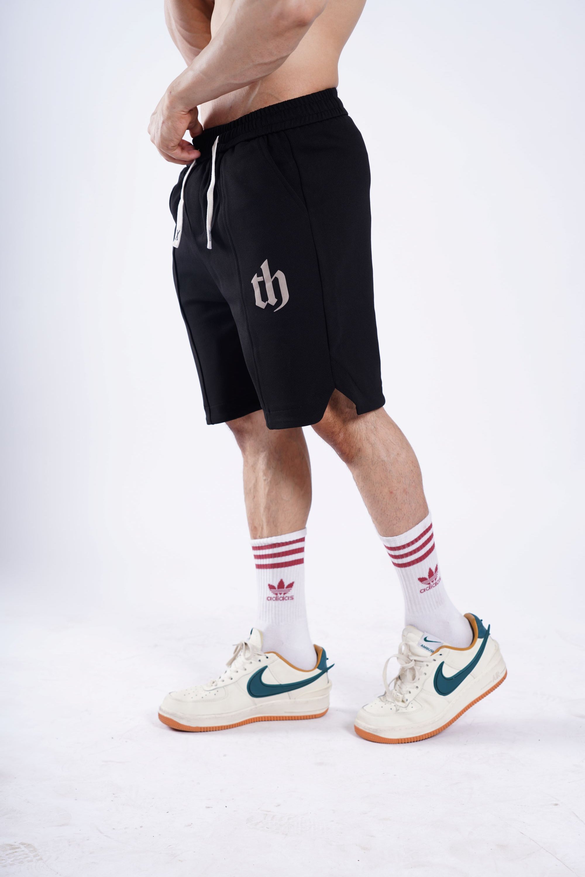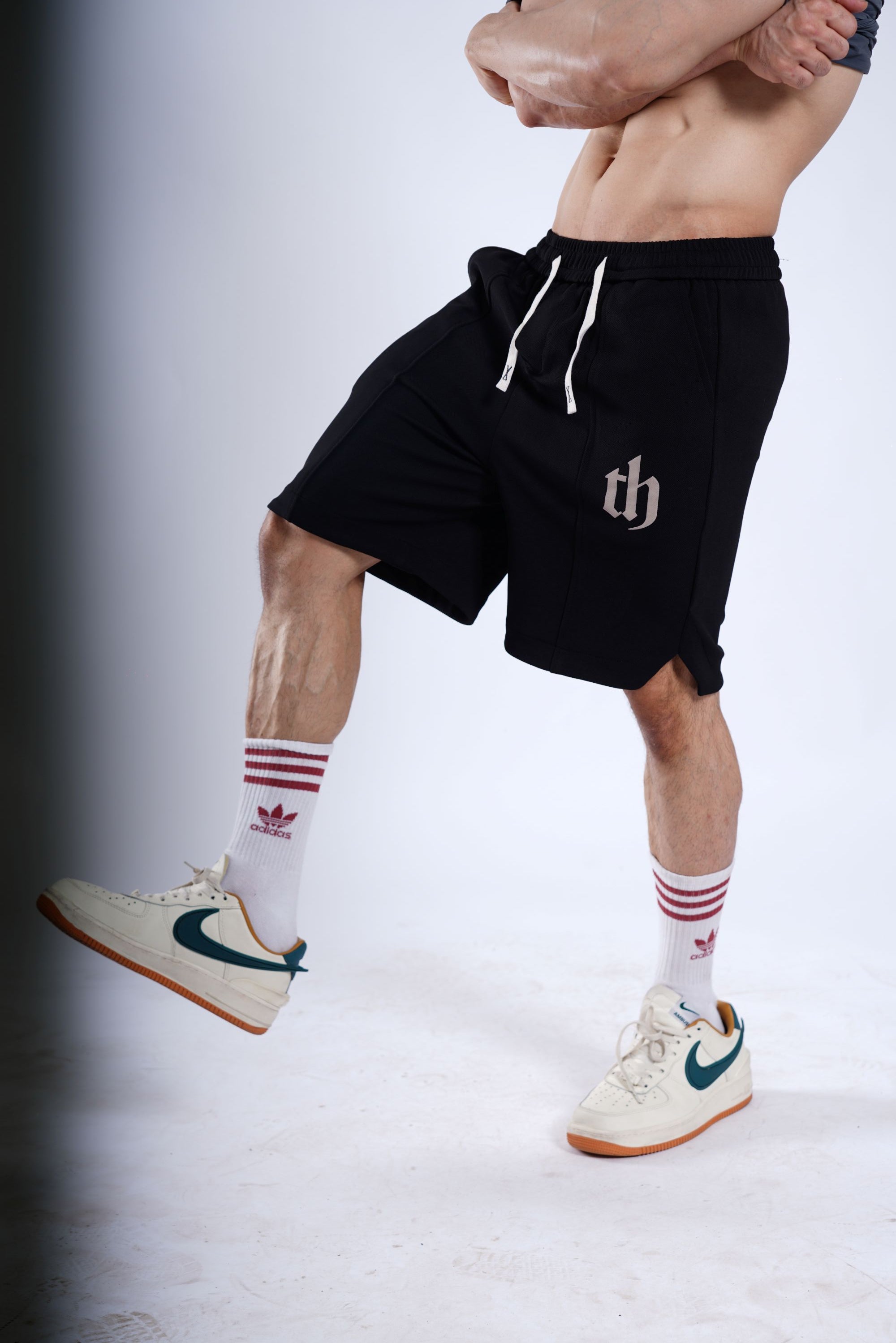 The tailored above-knee cut enhances leg definition, while the minimalist gothic monogram adds a refined signature touch. Elastic waistband with adjustable drawstrings ensures a secure fit, and functional pockets keep it practical without compromising style.