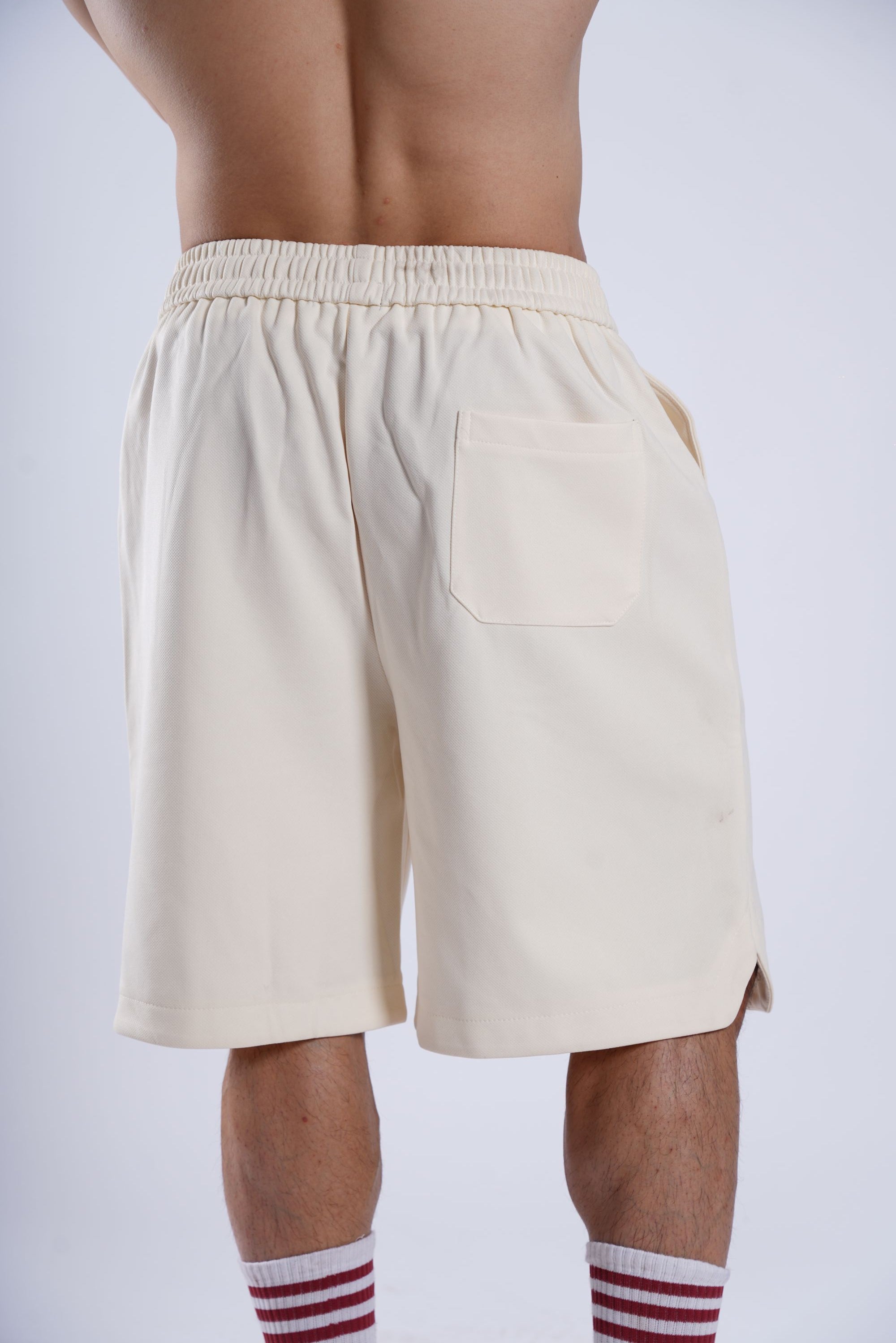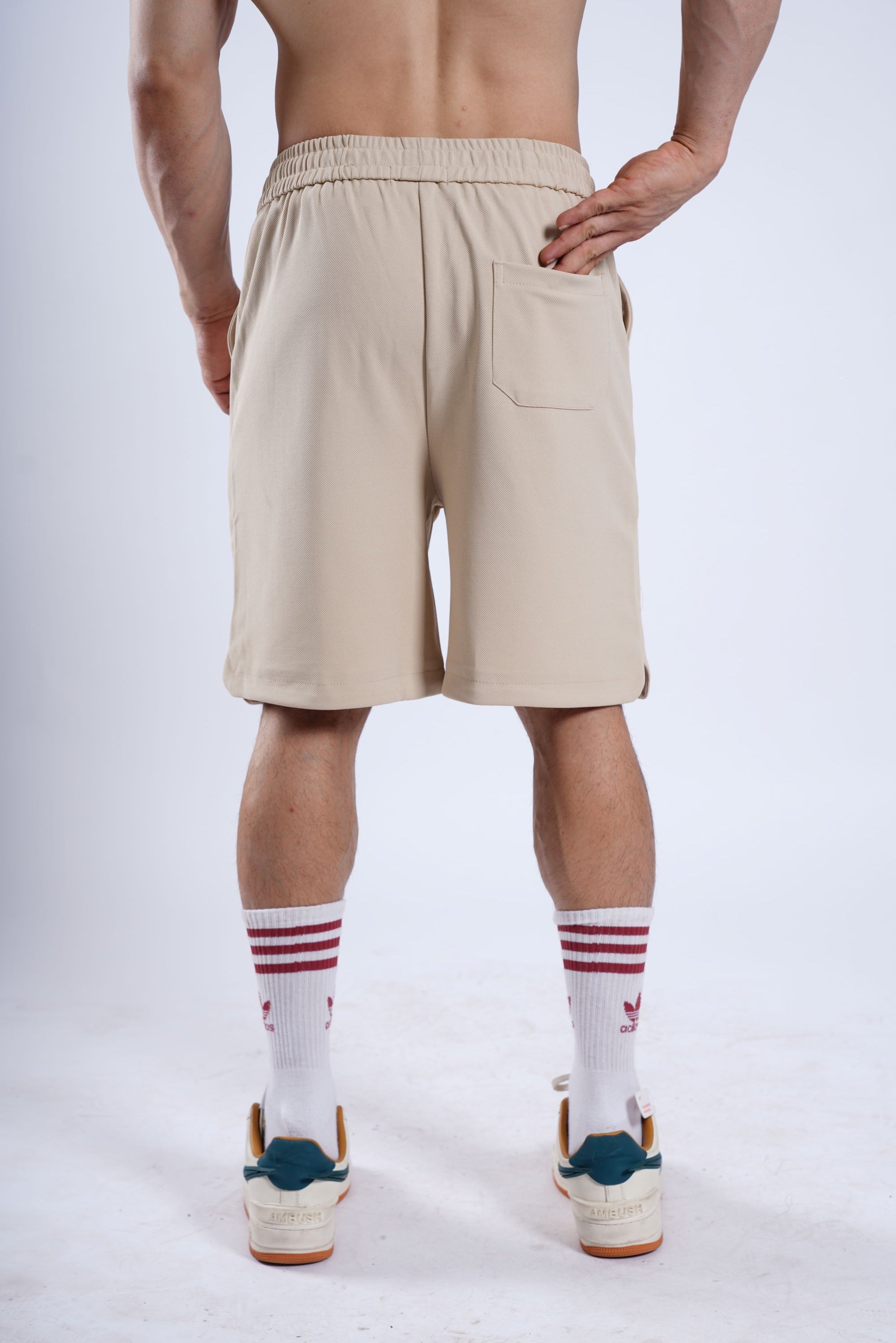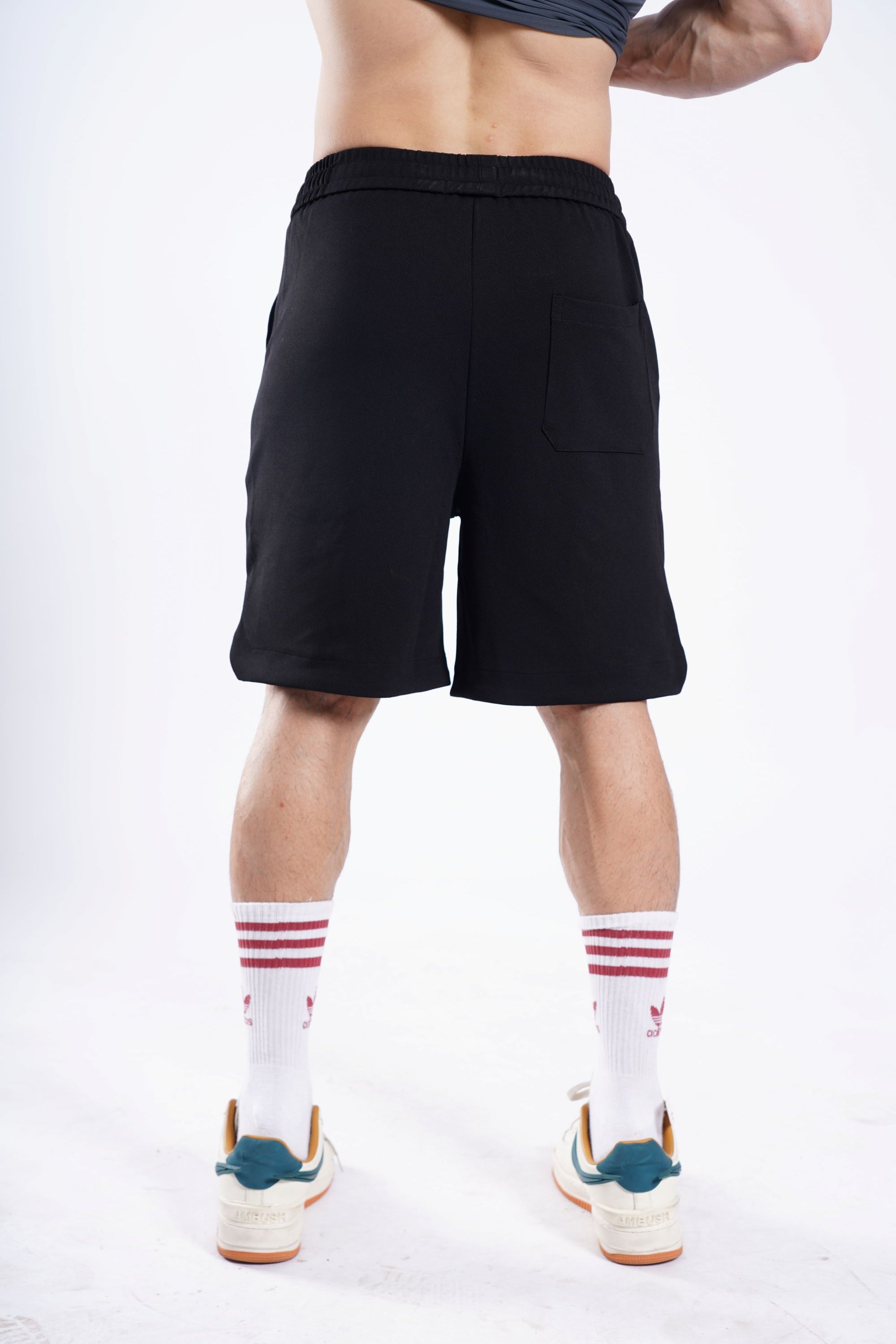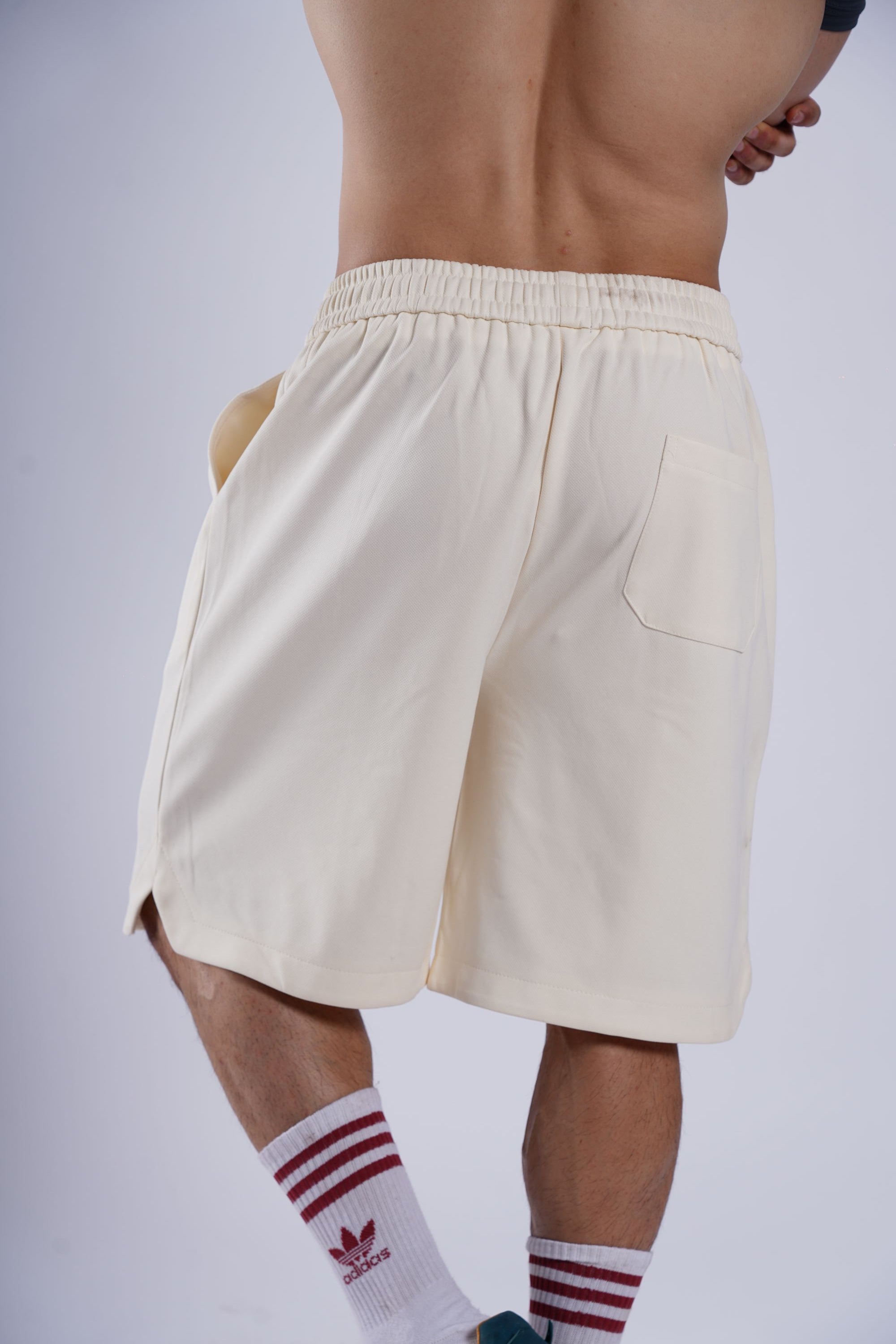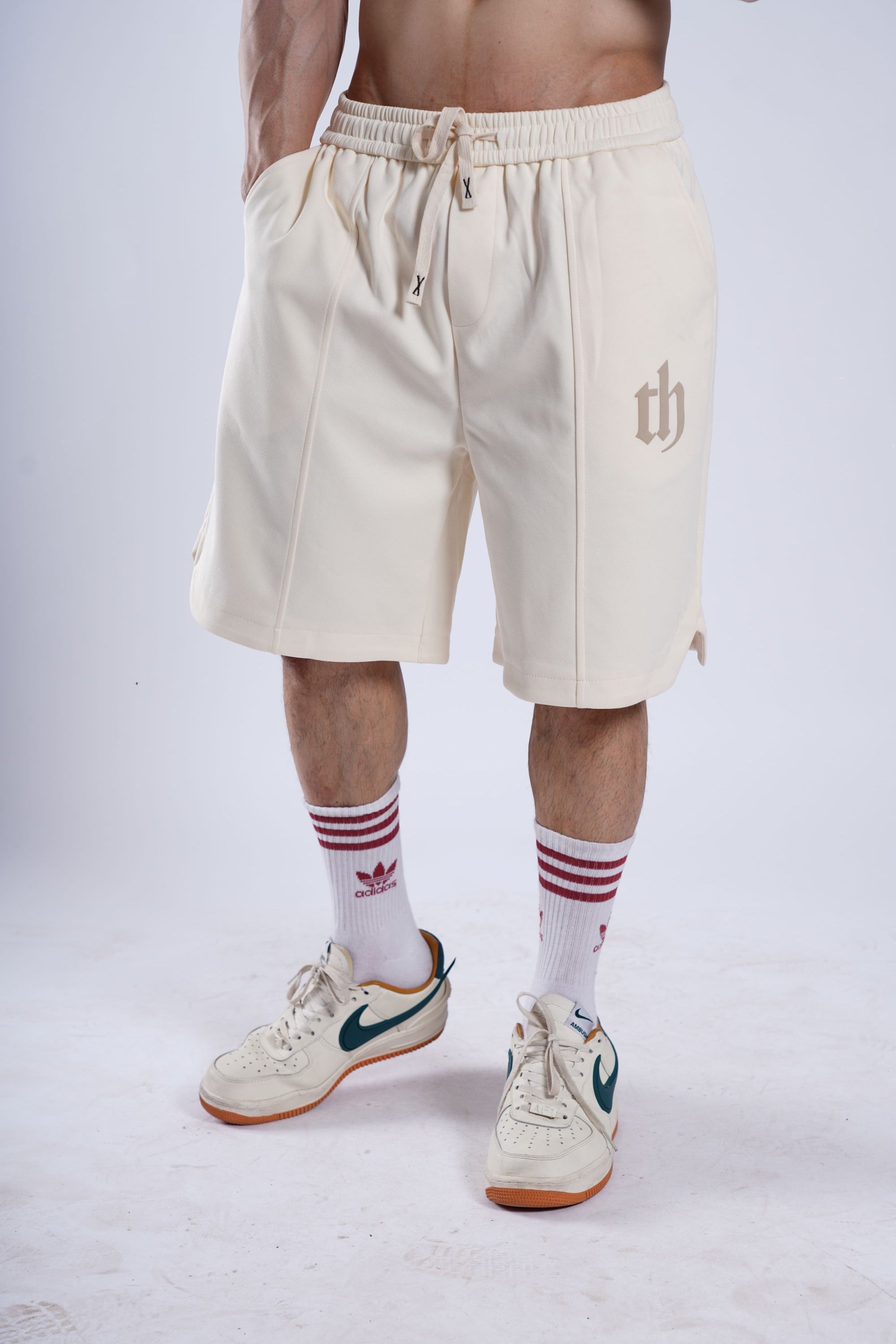 The tailored above-knee cut enhances leg definition, while the minimalist gothic monogram adds a refined signature touch. Elastic waistband with adjustable drawstrings ensures a secure fit, and functional pockets keep it practical without compromising style.