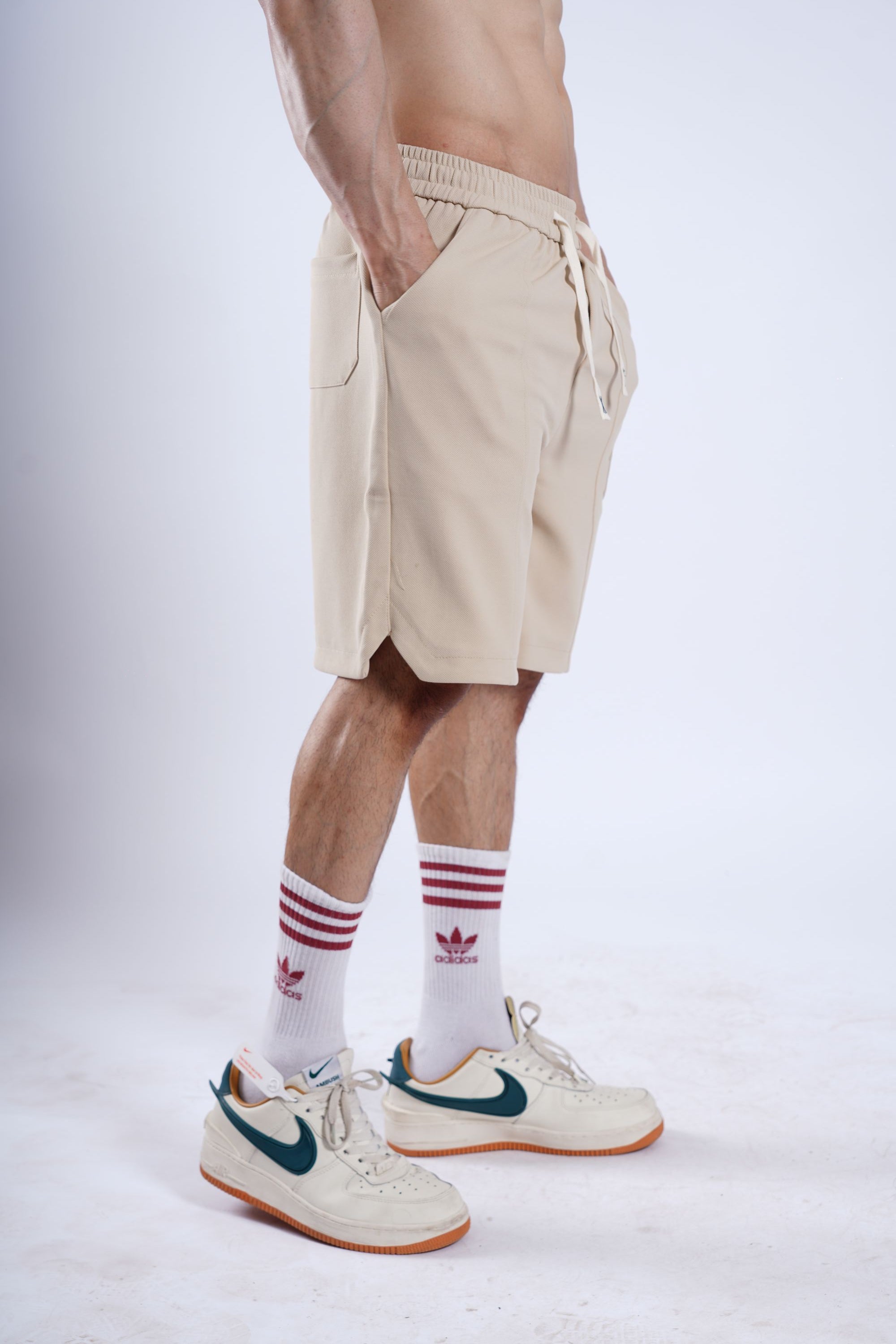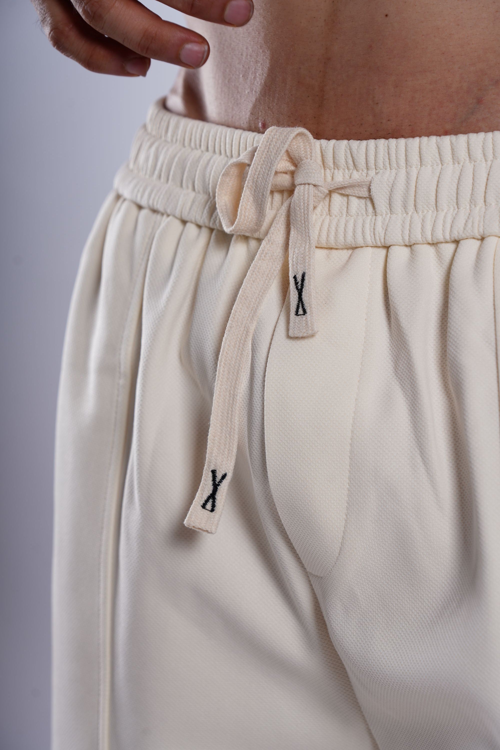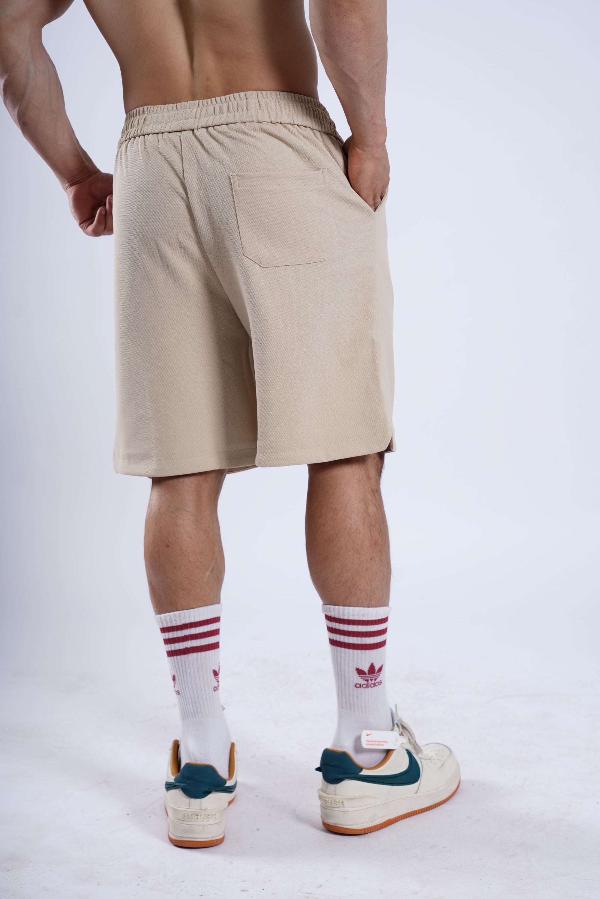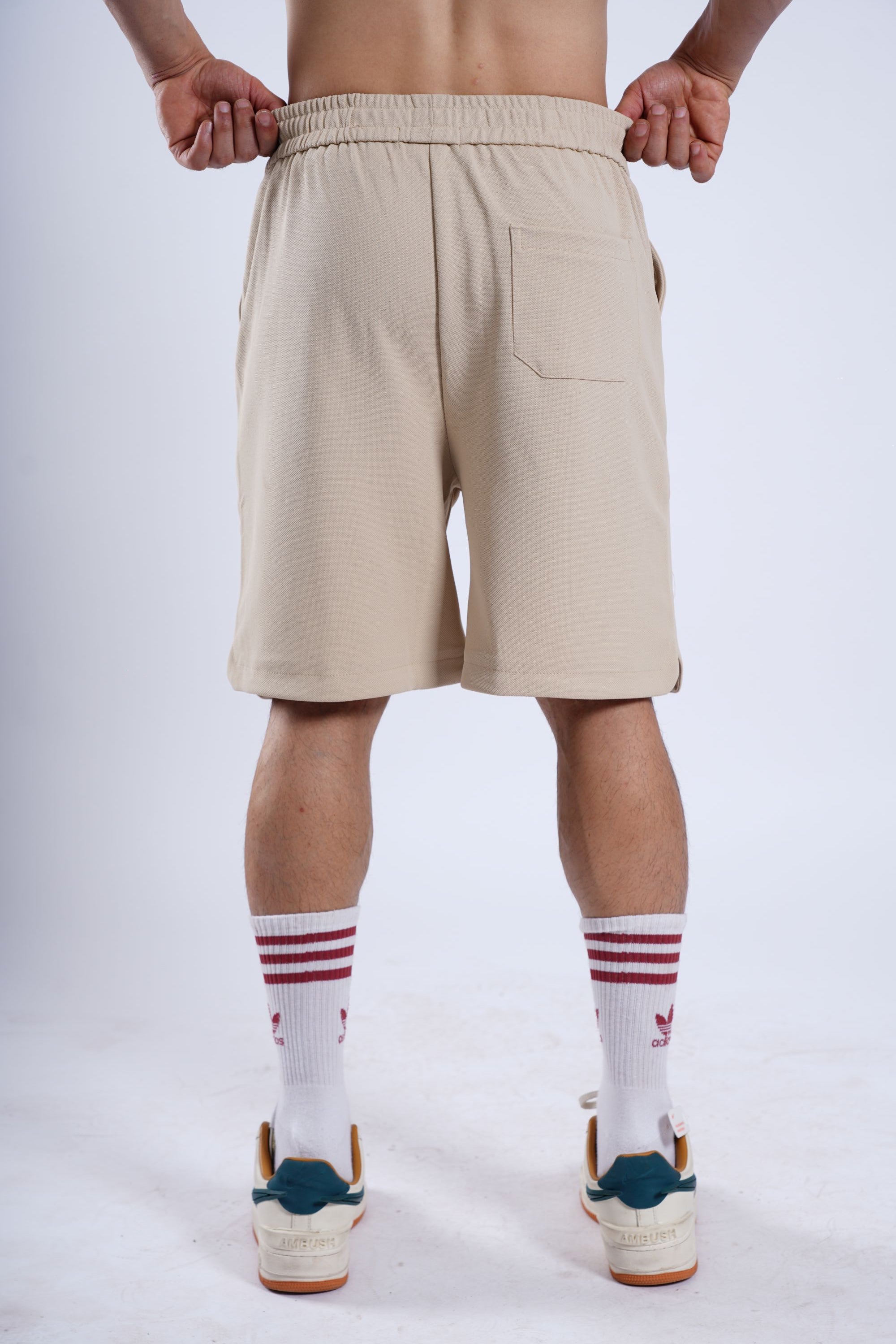 The tailored above-knee cut enhances leg definition, while the minimalist gothic monogram adds a refined signature touch. Elastic waistband with adjustable drawstrings ensures a secure fit, and functional pockets keep it practical without compromising style.
